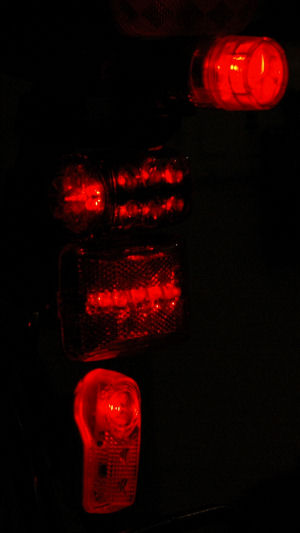 On each photo, we see from top to bottom: the BLT Rear Super Doppler, the Cateye TD-LD1000, the Vistalite Super Nebula and the Planet Bike Superflash.