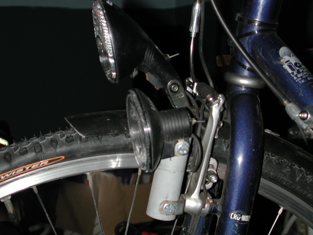 The main headlight was attached on the fork crown via a brake bridge because there is no brake hole in front of the fork. The secondary headlight was attached to the left brake boss via a piece of plastic EMT conduit to insulate it from the frame.